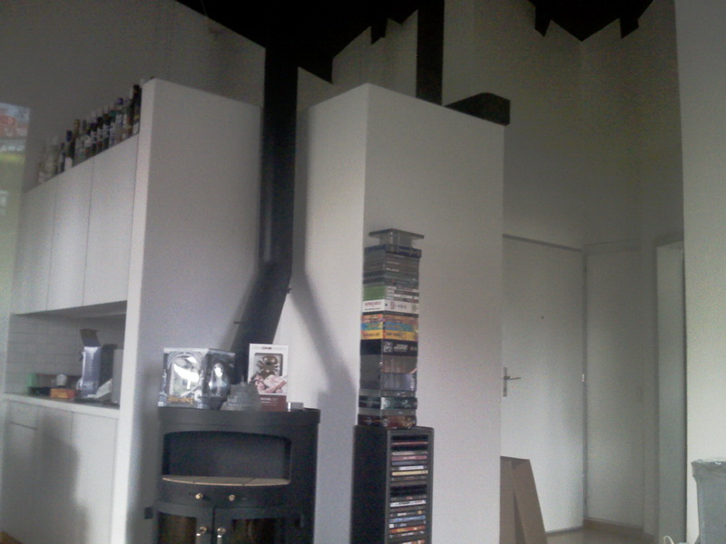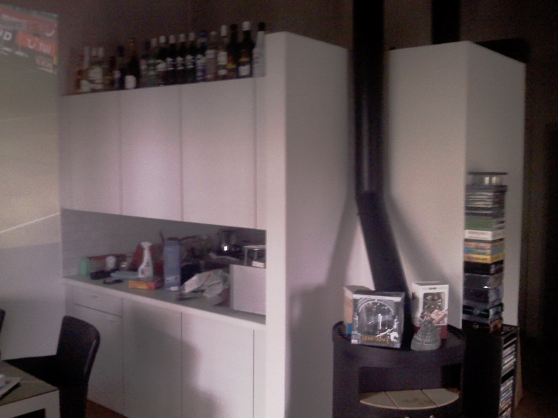 Bild 3, rechts vom Bild, da zwischen den Flaschen möchte ich den front Rechts Speaker drauf stellen... ca. 80-100 cm von der Wand weg, dann wärs gleich weit, wie auf der anderen Seite...